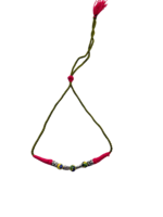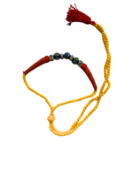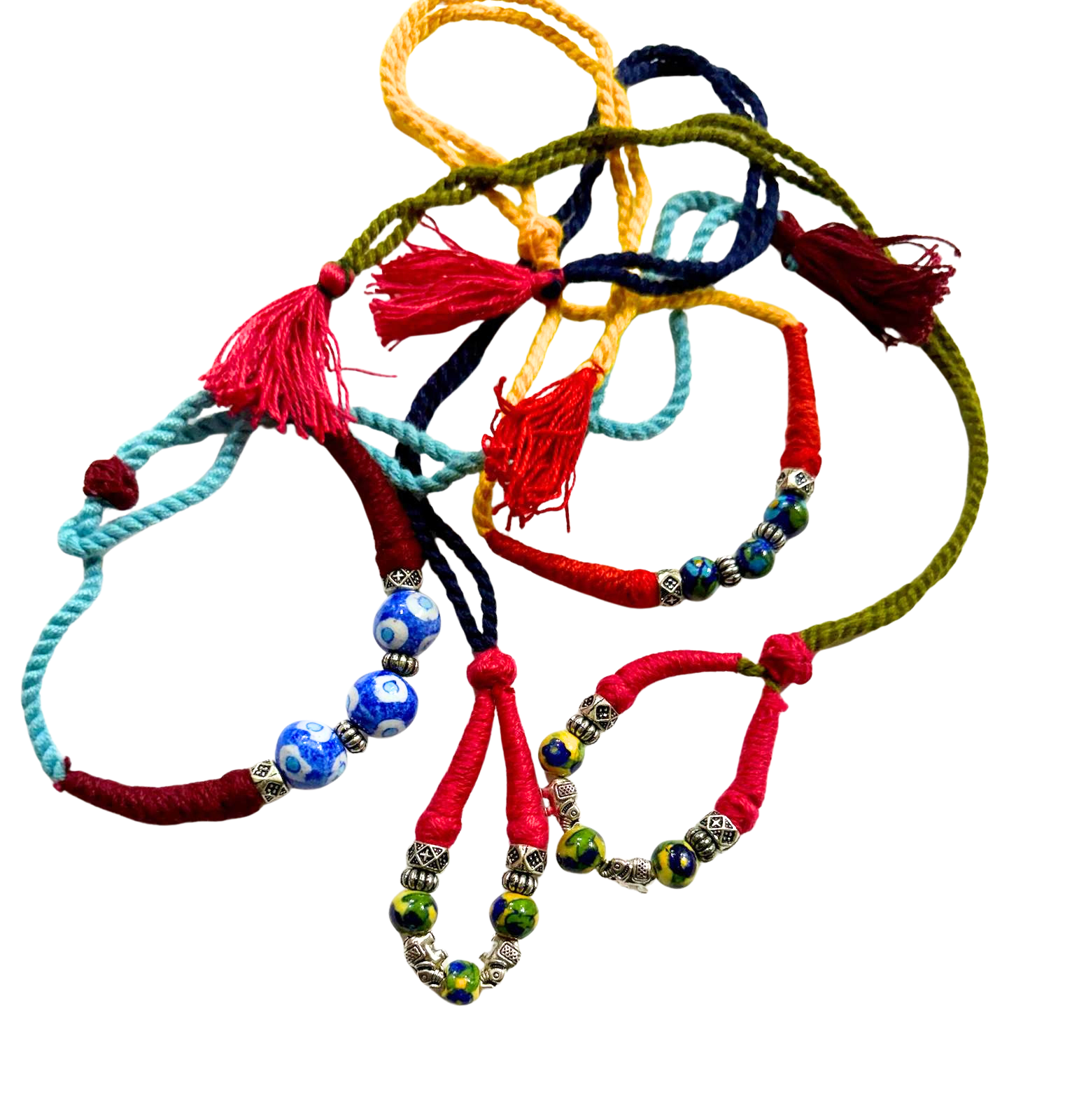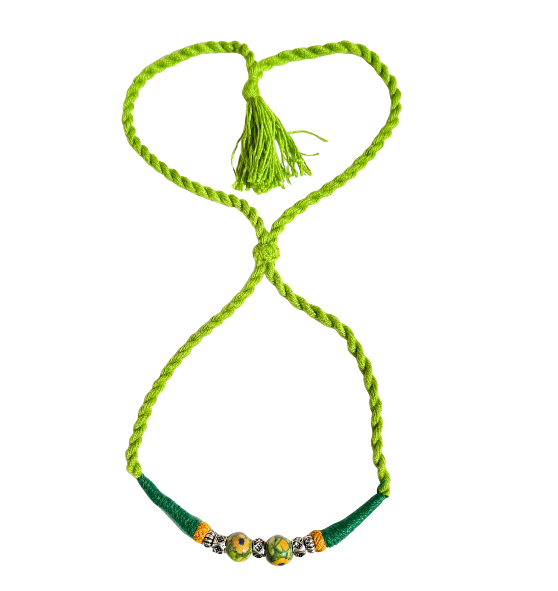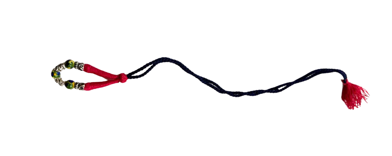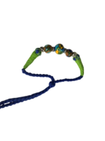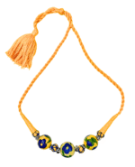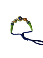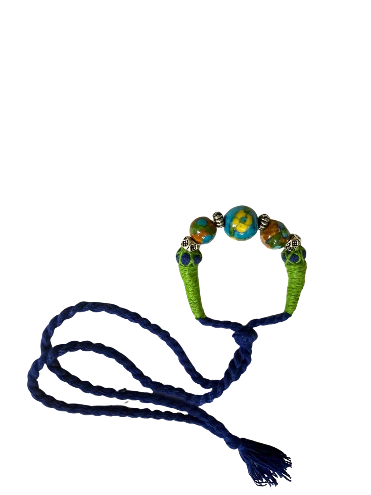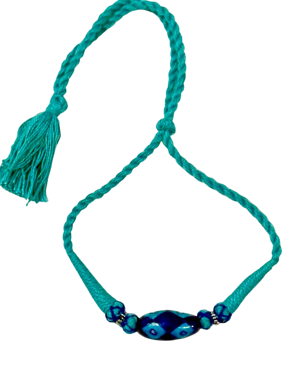 - Elegant design – a large blue pottery bead flanked by smaller beads, set on a braided cord with a stylish tassel.