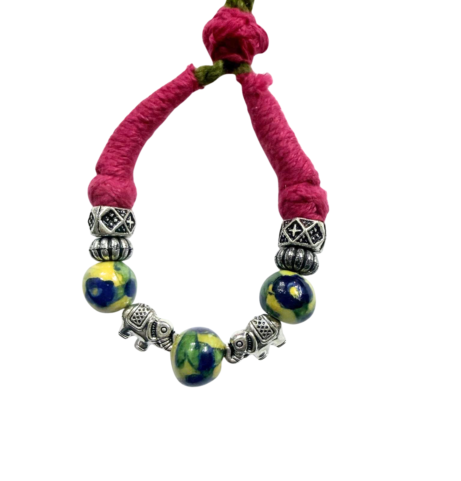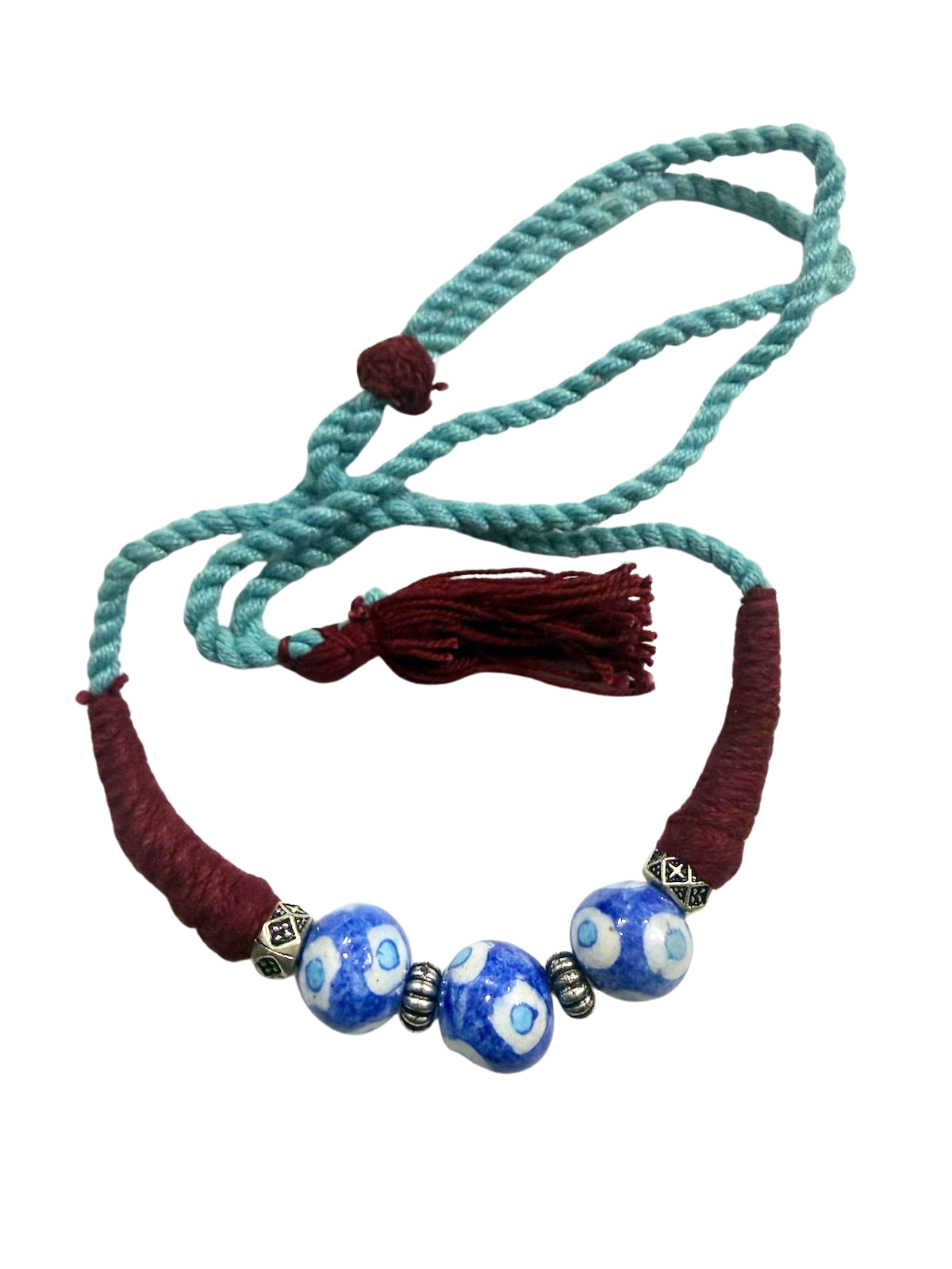 - Main bead: hand‑painted blue pottery.
