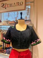 This elegant black blouse features a finely detailed Pichwai-inspired painting, thoughtfully created at Ahani. The graceful cow motif with blooming lotus elements adds a timeless, artistic charm to the garment.